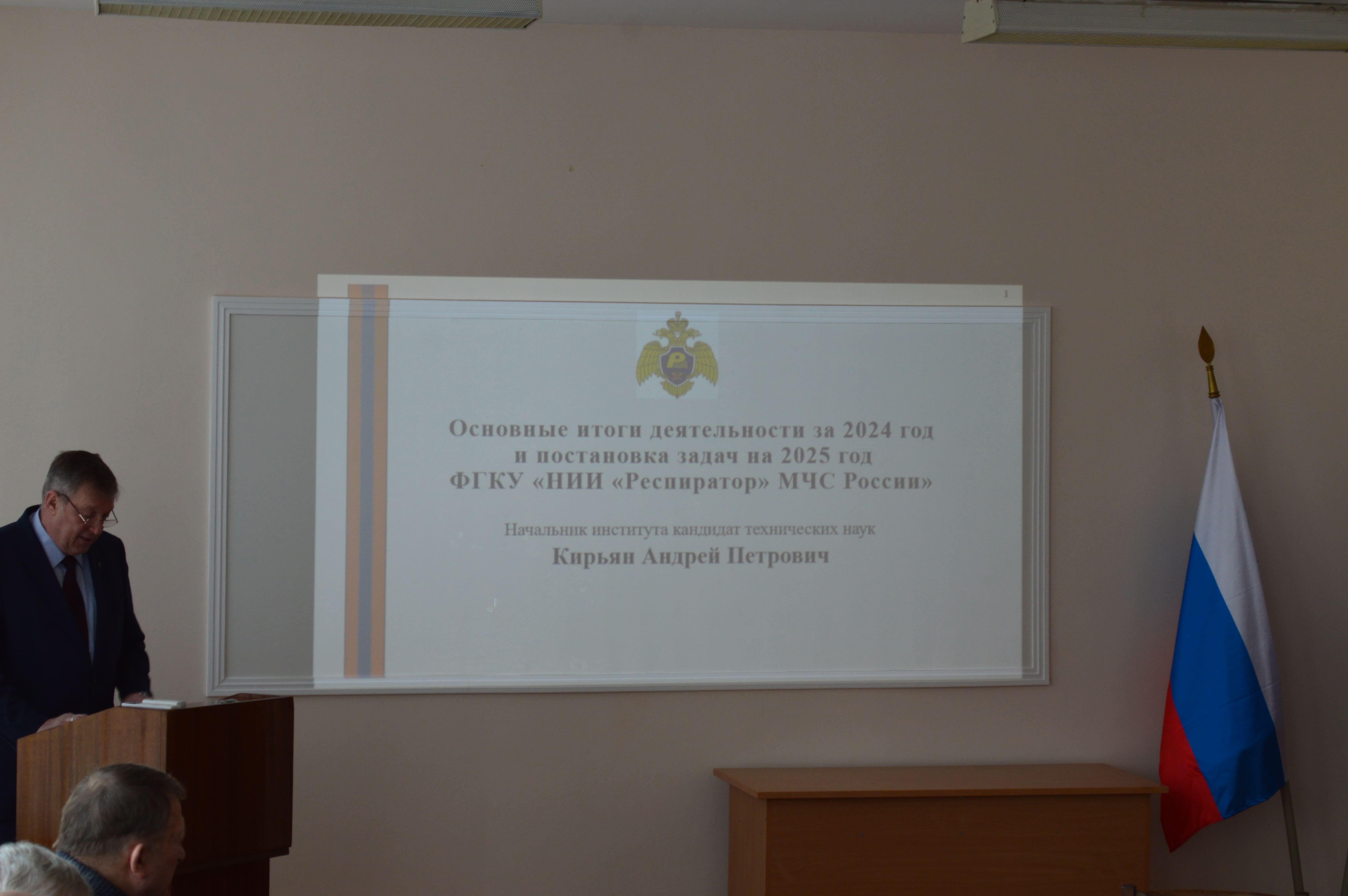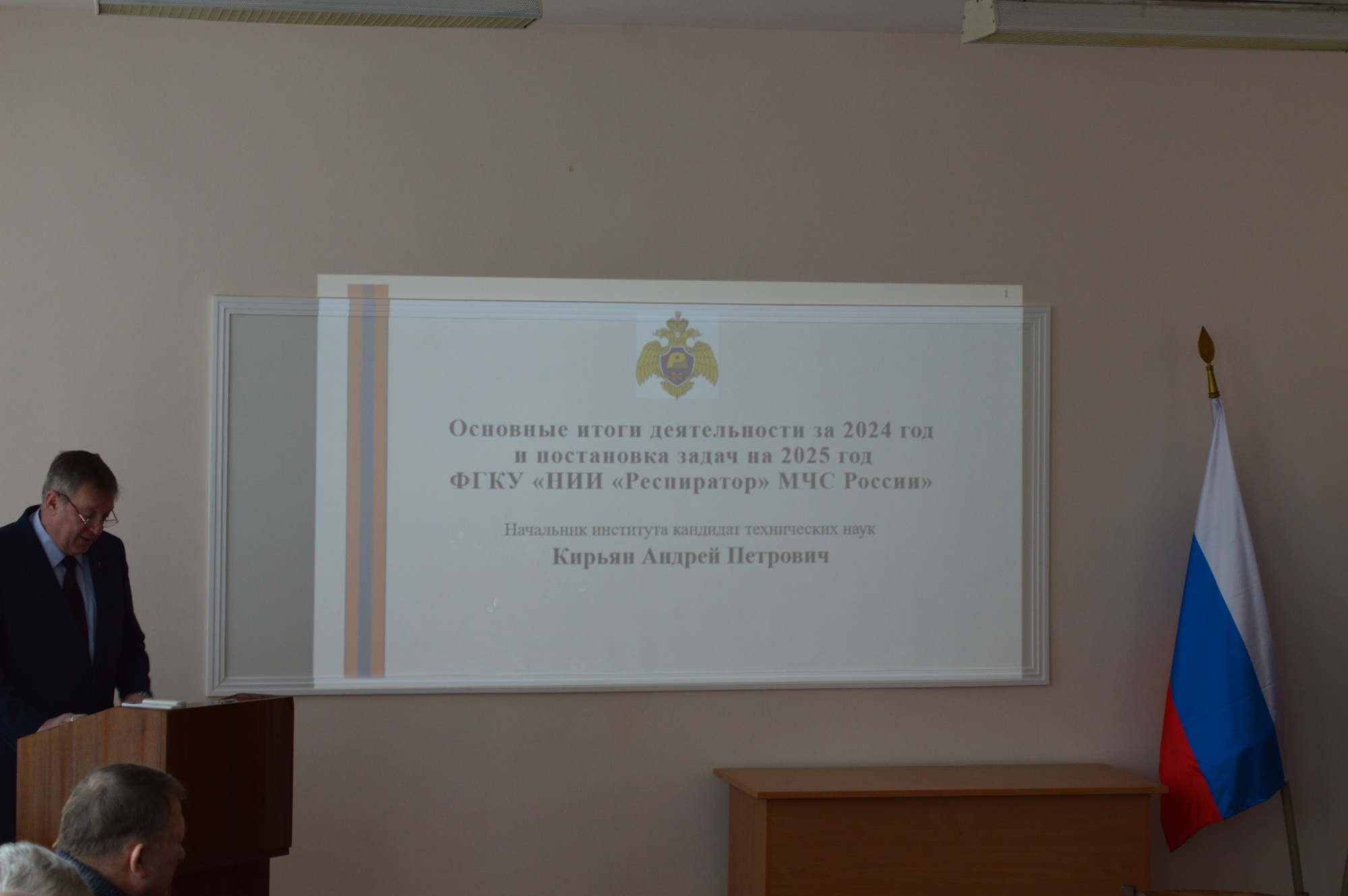 Начальник института кандидат технических наук Кирьян Андрей Петрович представил доклад «Об основных итогах деятельности ФГКУ «НИИ «Респиратор» МЧС России» за 2024 год и постановка задач на 2025 год». После обсуждения основных тезисов и перспективных направлений работы доклад был одобрен и принят к сведению.