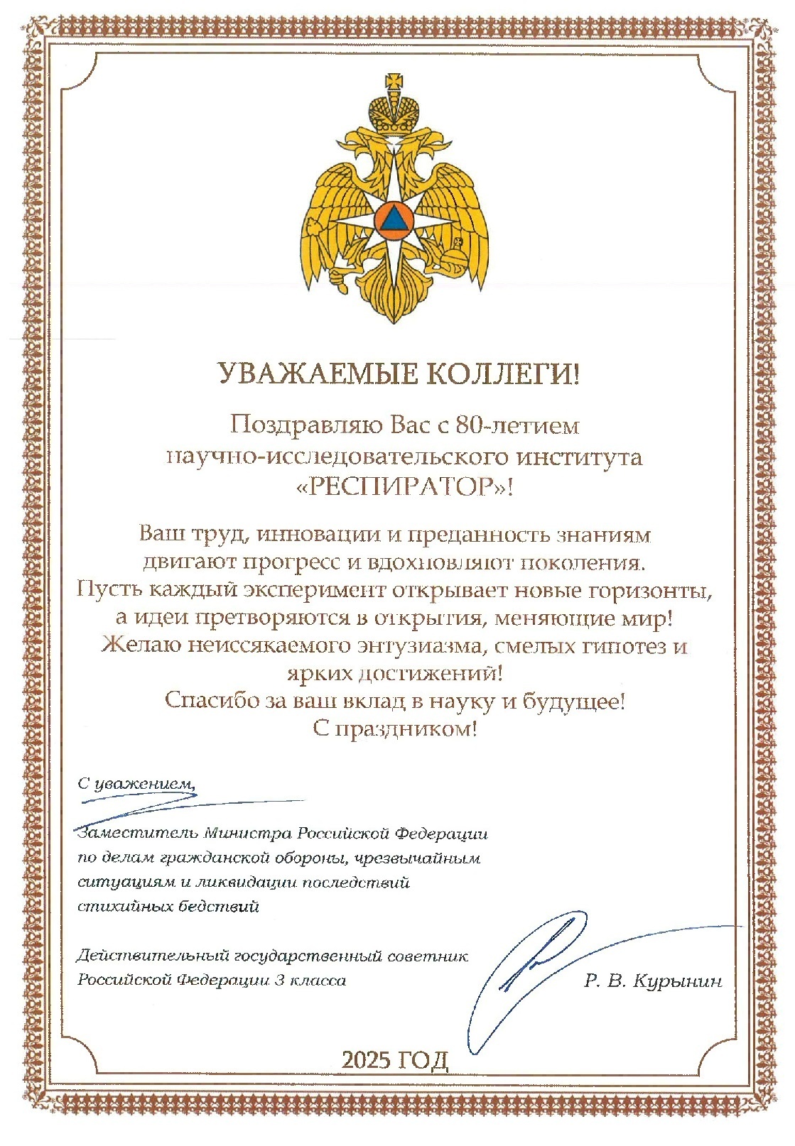 Поздравление Заместителя Министра Российской Федерации по делам гражданской обороны, чрезвычайным ситуациям и ликвидации последствий стихийных бедствий Р. В. Курынина с 80-летием научно-технической деятельности НИИ «Респиратор»